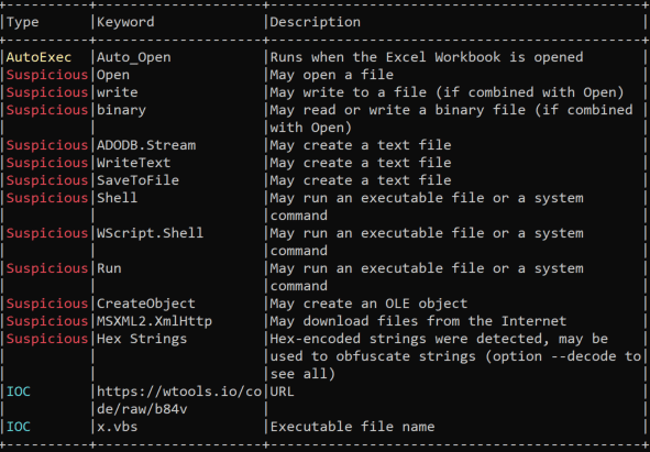 Our suspicions are confirmed that this document not only contains macro code (Auto_Open), but also spawns WScript.exe, creates and drops files, communicates with a URL.