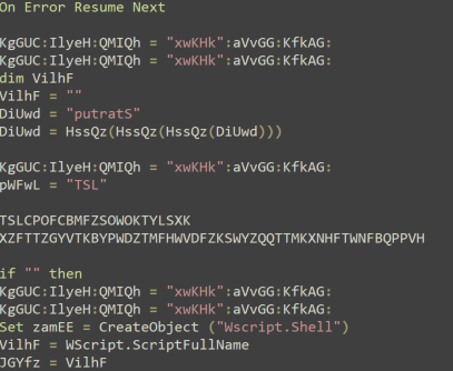 In Figure 3, we can clearly make out the word “Startup” reversed at the DiUwd variable. A few lines down, we see some string concatenation, an if-else block, as well as a call to WScript.Shell.