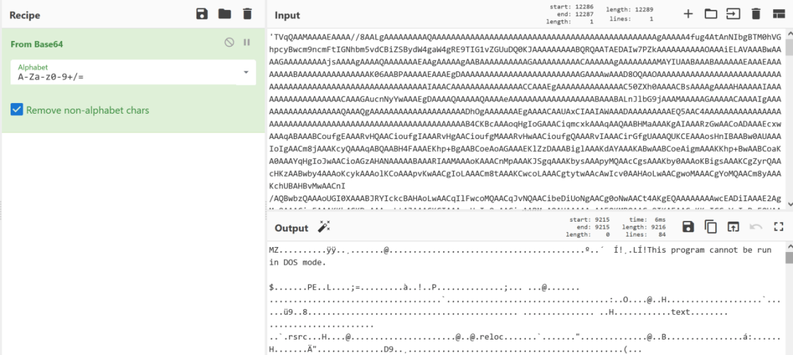 Once all characters are replaced and combined, we can throw the Base64 encoded data in CyberChef to see what’s behind the curtain (the ‘TVqQ’ maybe a giveaway).