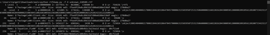 rtfdump.py -s 236 -H unknown_220509.rtf (the “H” displays the output in hex format)