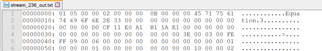 In the above output, we can see “Equation.3”, reinforcing our belief that this document is likely exploiting CVE-2018-0798.