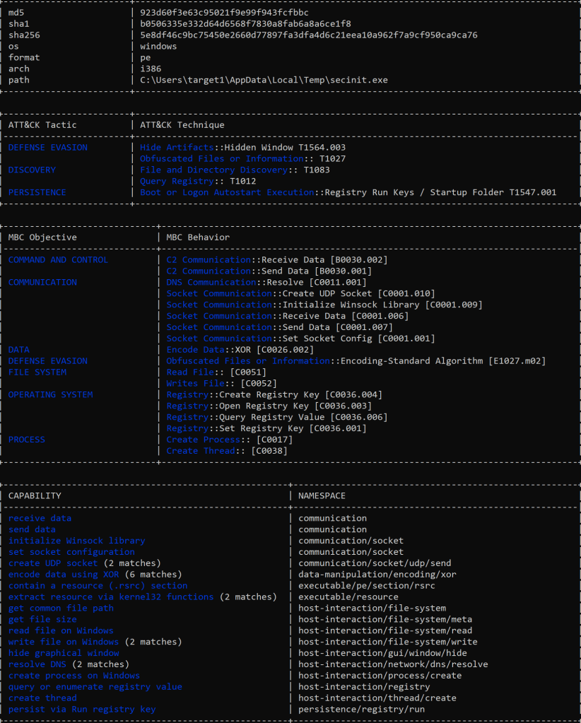 Now that we have extracted a secondary payload, we can get an idea of its capabilities using Mandiant’s CAPA tool.