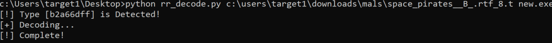 The above identified encoding as well as taking a look at the object strings (objw2180 objh300 objdata 554567…), confirms the Space Pirates group may have used v4 of Royal Road in their campaign.