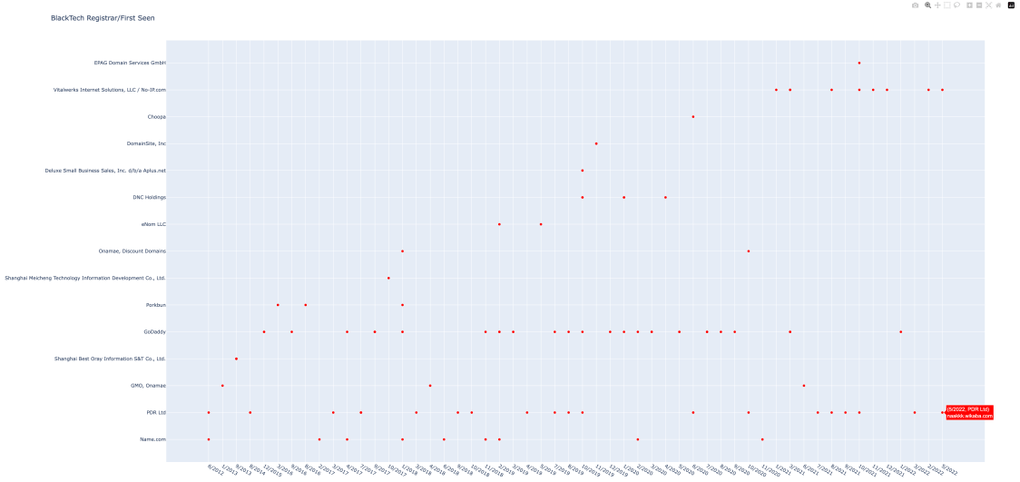 As seen in the below scatter plot, PDR Ltd. and Vitalwerks Internet Solutions, LLC represents the majority of registrars linked to BlackTech recently.